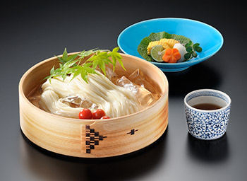 - 沸騰したお湯で決められた時間うどんを茹でて、茹で上がったうどんはざるに取り、麺のヌメリが取れるまで冷たい流水でもみ洗いし、水気を切って器に盛る。
